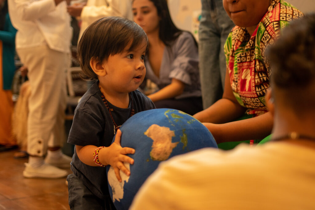 A bola em forma de Terra erguida por Wynoã Tukumãí, 1 ano e 4 meses, durante a oficina Terra Sonhada, traz uma imagem única para